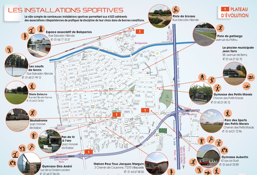 Villeparisis compte de nombreuses installations sportives qui permettent aux 4 600 adhérents des différentes associations de pratiquer l’activité de leur choix. On trouve ainsi à Villeparisis trois gymnases, deux stades, un skate Park, une patinoire, la piscine Jean Taris (qui ouvre sa coupole aux beaux jours) mais également quatre courts de tennis, un boulodrome et un pas de tir à l’arc. (ci-contre plan des installations copyright mairie de Villeparisis).